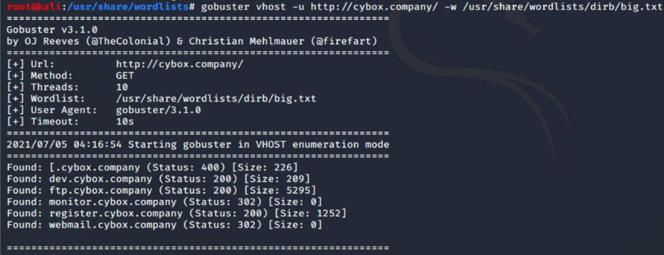 gobuster vhost -u http://cybox.company/ -w /usr/share/wordlists/dirb/big.txt