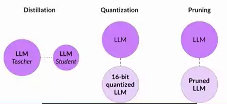 Distillation: uses a larger model, the teacher model, to train a smaller model, the student model, we freeze teacher's weights and generate completions, also generate student model's completion, the difference between those 2 completions is Distillation Loss . Student model will adjust its final prediction layer or hidden layer. You then use the smaller model for inference to lower your storage and compute budget.