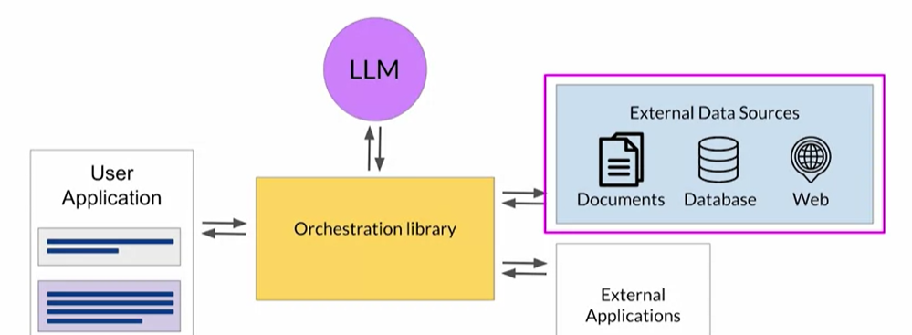 Orchestrator: can manage the information between LLM, external app and external databases. ex. Langchain