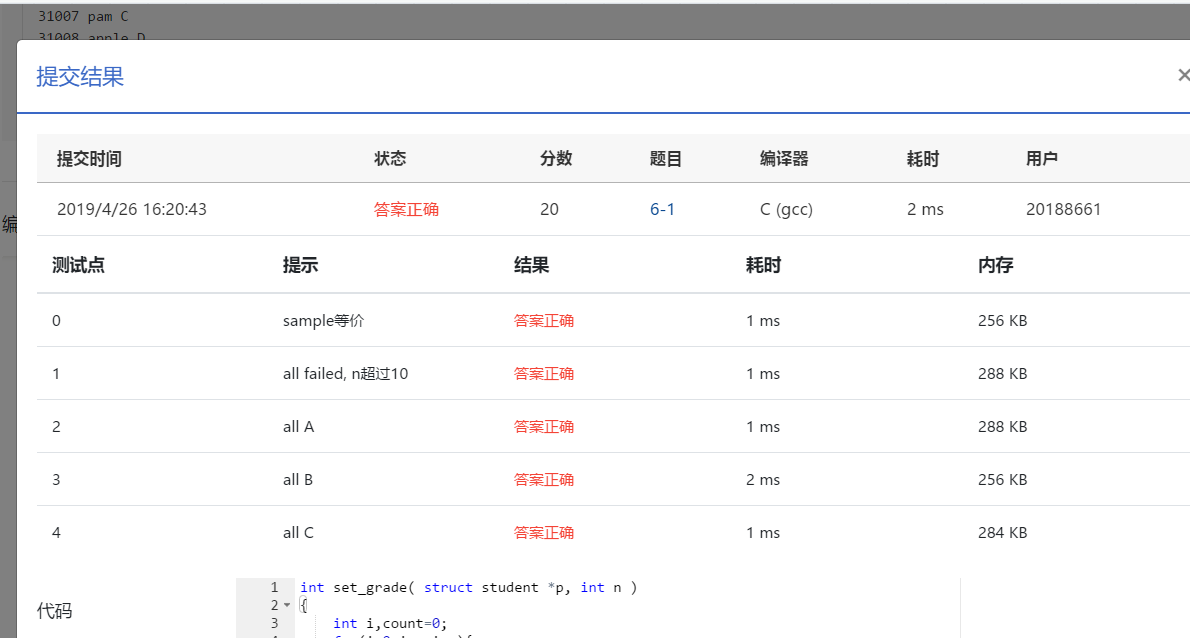 n是数组元素个数。学号num、姓名name和成绩score均是已经存储好的。set_grade函数需要根据学生的成绩score设置其等级grade。等级设置:85-100为A,70-84为B,60-69为C,0-59为D。同时,set_grade还需要返回不及格的人数。