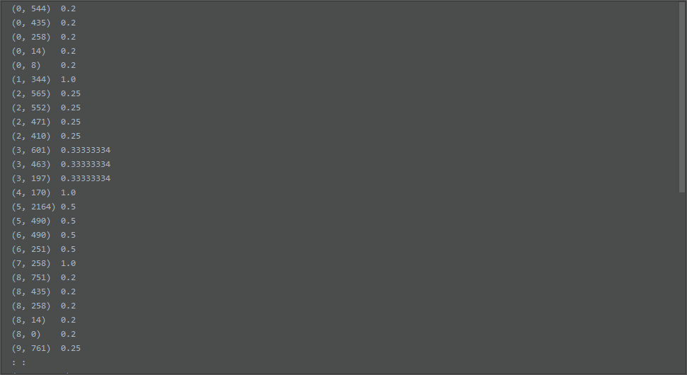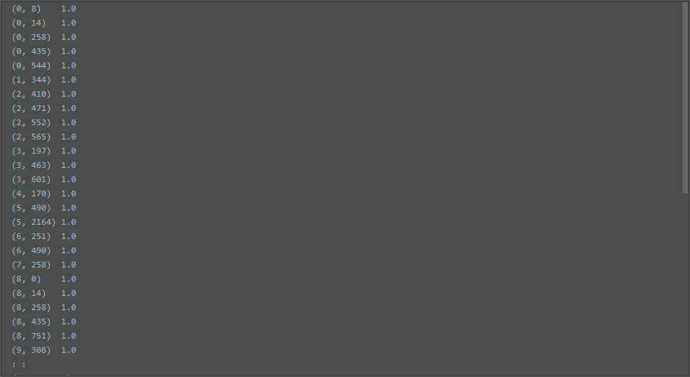 需要注意的是:由于特征中有很多的内容是“0”,因此使用稀疏矩阵的方式进行存储,因此经过该函数归一化之后的函数,仍然为一个稀疏矩阵。
