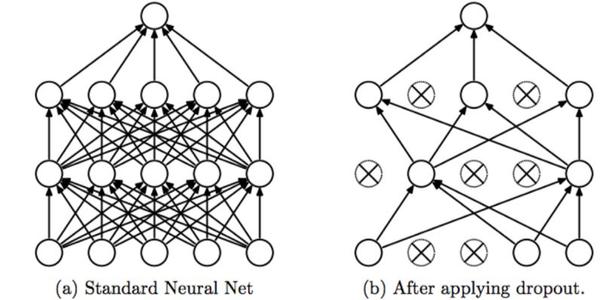 在前向传播的时候,让某个神经元的激活值以一定的概率p停止工作,这样可以使模型泛化性更强,因为它不会太依赖某些局部的特征,如图所示: