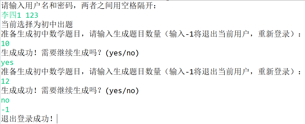 3.整个系统的完整度较高,有登陆提示语、退出提示语,用户体验感较好;生成的试卷题目符合每个组别的题目要求且题目形式全面;生成试卷后能够生成按规定命名的文件夹,且可以重复多次地生成不同的试卷。