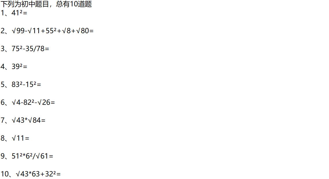 public void GeneratingSeniorProblem() { //生成高中题目的函数 String[] lOperator=new String[] {"+", "-", "*", "/" }; String[] mOperator=new String[] {"²", "√" }; String[] hOperator=new String[] {"sin", "cos", "tan"}; Date now = new Date(); SimpleDateFormat format = new SimpleDateFormat("yyyy-MM-dd-HH-mm-ss"); String NowTime = format.format( now ); FileWriter writer; String str="下列为高中题目,总有"+m_cnt+"道题\r\n"; Random random = new Random(); for(int i=0;i<m_cnt;i++) { str+=i+1+"、"; int number=random.nextInt(5)%5 + 1; //生成一个1~5的随机数 String[] operand=new String[number]; int rd=random.nextInt(99)+1; int onezero=random.nextInt(3); operand[0]=hOperator[onezero]+rd; for(int j=1;j<number;j++) //获得number个0--99的数字及²、√、sin、cos、tan组成的字符串 { rd=random.nextInt(99)+1; onezero=random.nextInt(8); if(onezero>4) { operand[j]=""+rd; continue; } else if(onezero==3) { operand[j]=rd+mOperator[onezero-3]; continue; } else if(onezero==4) { operand[j]=mOperator[onezero-3]+rd; continue; } operand[j]=hOperator[onezero]+rd; } int j=random.nextInt(number); for(int n=0;n<number-1;j++,n++) { int temp=random.nextInt(4); str+=operand[j]+lOperator[temp]; if(j==number-1) j=-1; } str+=operand[j]+"="+"\r\n\r\n"; } try { String root="src/"+m_username+"/"+NowTime+".txt";; writer = new FileWriter(root); writer.write(str); writer.flush(); writer.close(); } catch (IOException e) { e.printStackTrace(); } }