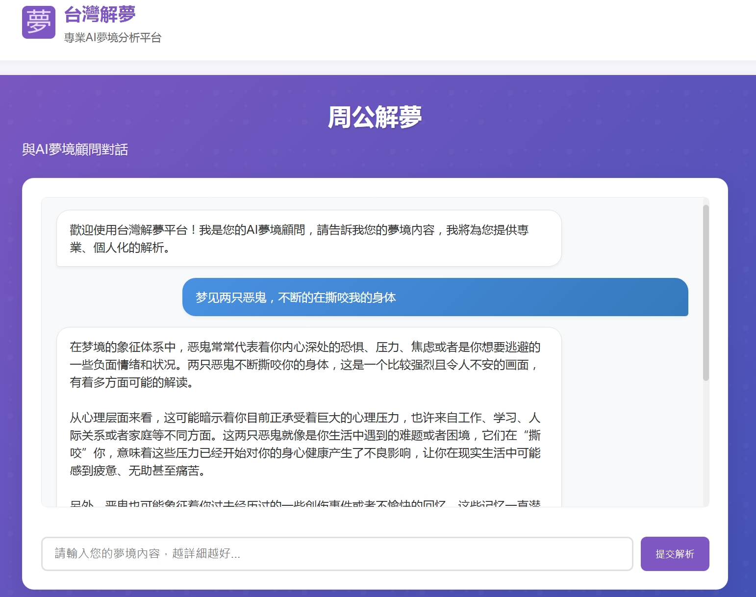 不仅直接能用不用注册,而且还无广告,并且可以直接和网站的解梦机器人对话,一下子就让我眼睛为之一亮,我立刻,输入了我的梦境。我是梦见两只恶鬼,不断的在撕咬我的身体,非常恐怖,我输入后,立即给了我答案,看截图,