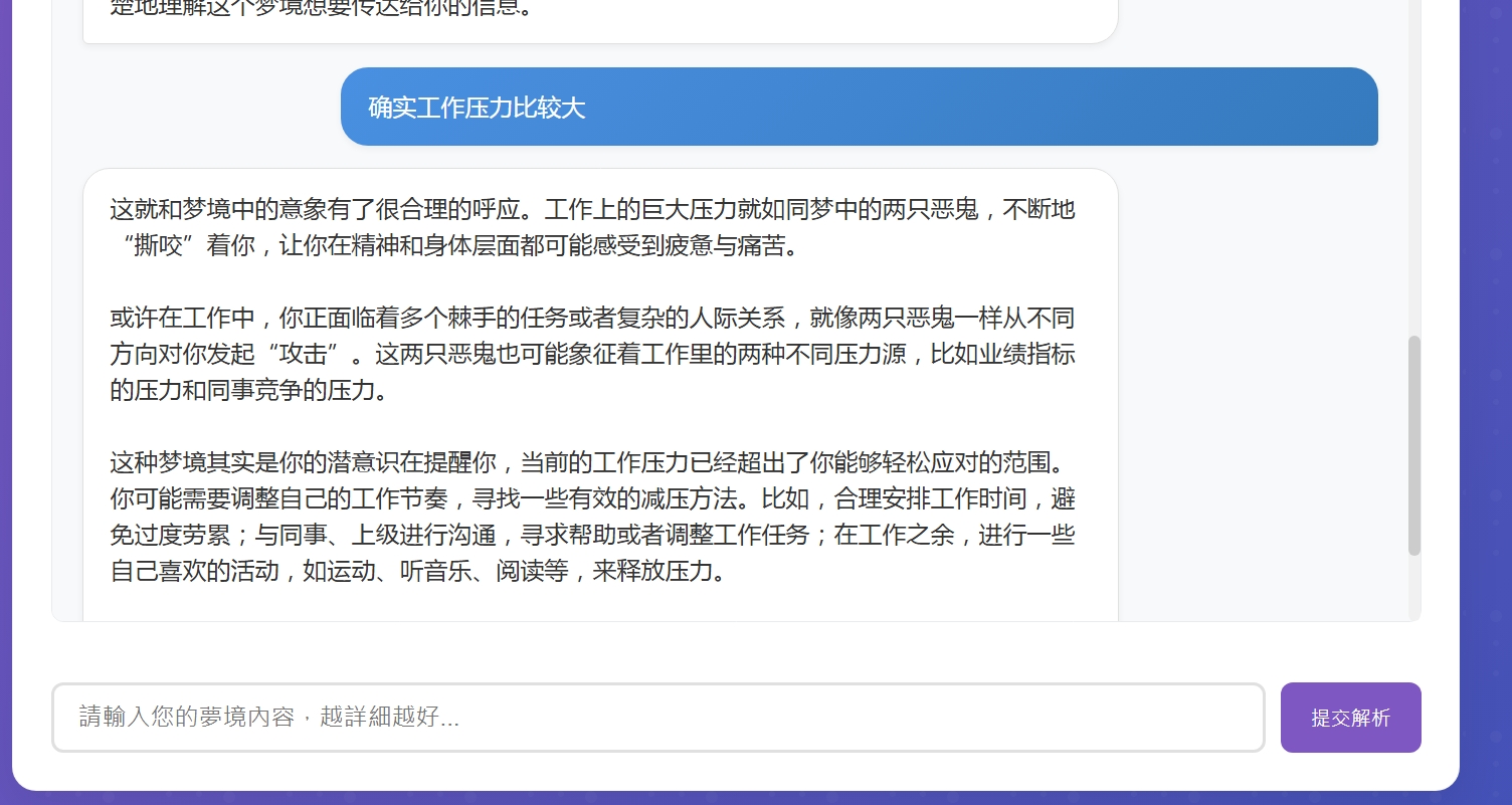 它不仅从各种层面来分析你做这个梦境的原因,还给出了目前生活中的反思,你可以继续给他对话