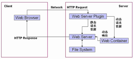 动态WEB中,程序依然使用客户端和服务端,客户端依然使用浏览器(IE、FireFox等),通过网络(Network)连接到服务器上,使用HTTP协议发起请求(Request),现在的所有请求都先经过一个WEB Server Plugin(服务器插件)来处理,此插件用于区分是请求的是静态资源(*.htm或者是*.htm)还是动态资源。