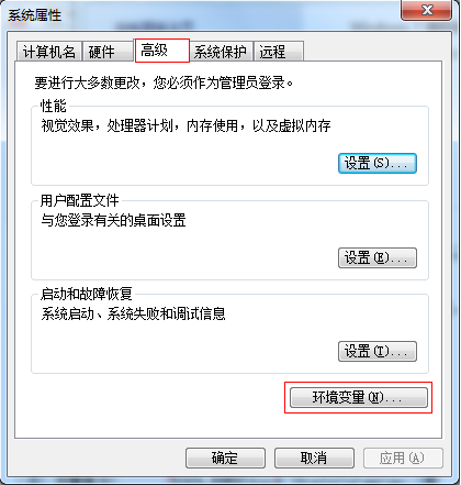 操作步骤(win7系统):计算机→右键“属性”→高级系统设置→高级→环境变量,如下图所示: