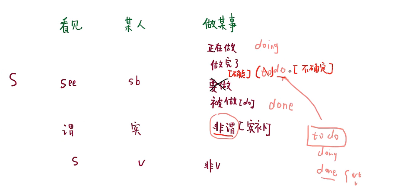 名称 抽象 本质 运用 不定式 to do 不确定(宏观),从较长的时间段来看,如果句子中有时间段,就以句子的时间段为准 将来,目的,一次性(看见整个过程,要省略to的不定式) 动名词 doing 确定(宏观),从较长的时间段考虑,如果句子中有时间段,就以句子的时间段为准 长期,稳定,习惯,确定,主动(本身就带有确定的含义) 分词(现在) doing 分身(微观,与谓语动词同时发生) 与谓语动词同步发生,这里的现在表示和谓语同时发生的,所以叫现在分词 分词(过去) done 省略(微观,,主要做后置定语,谓语动词之前发生) vi:完成