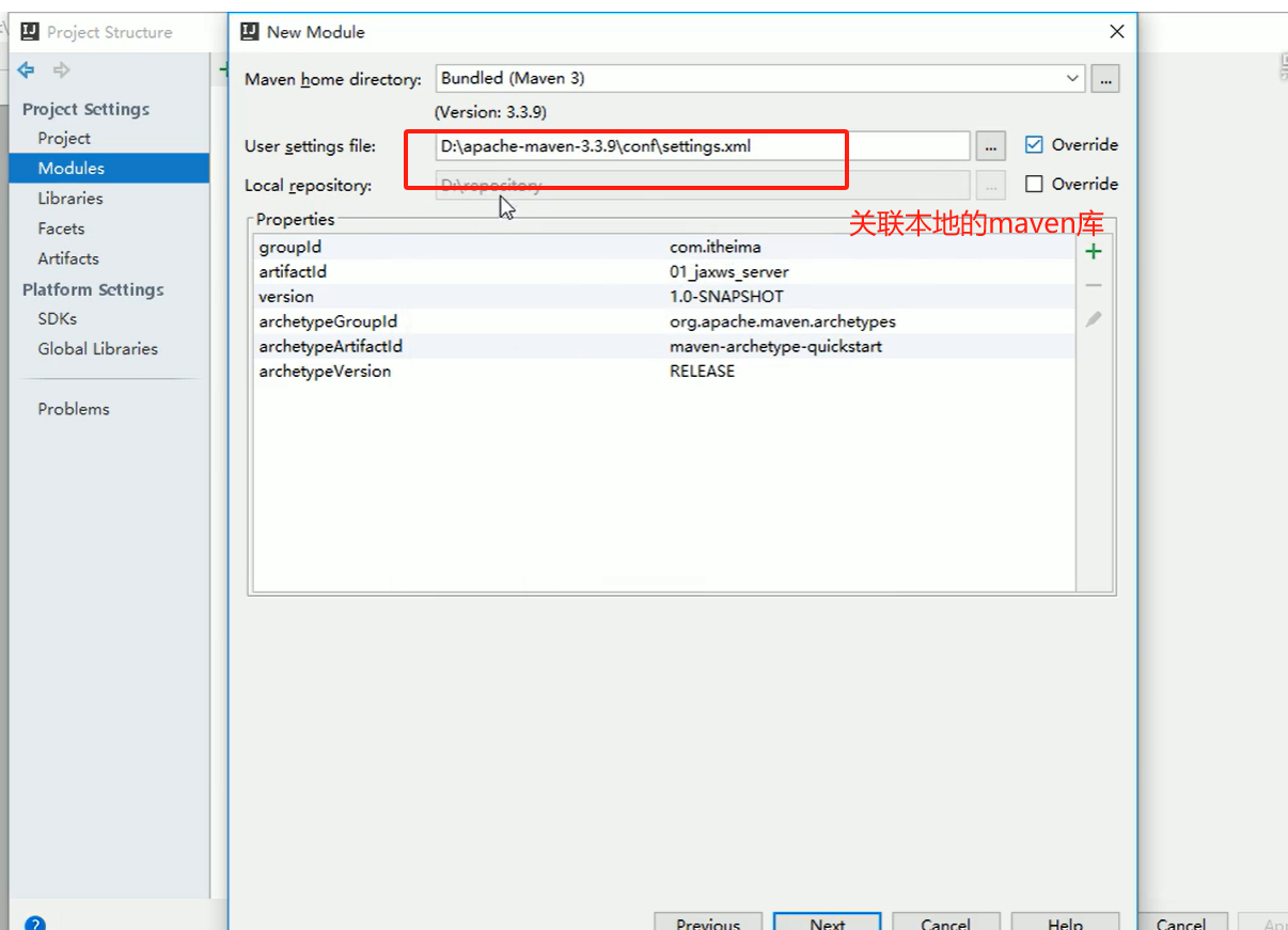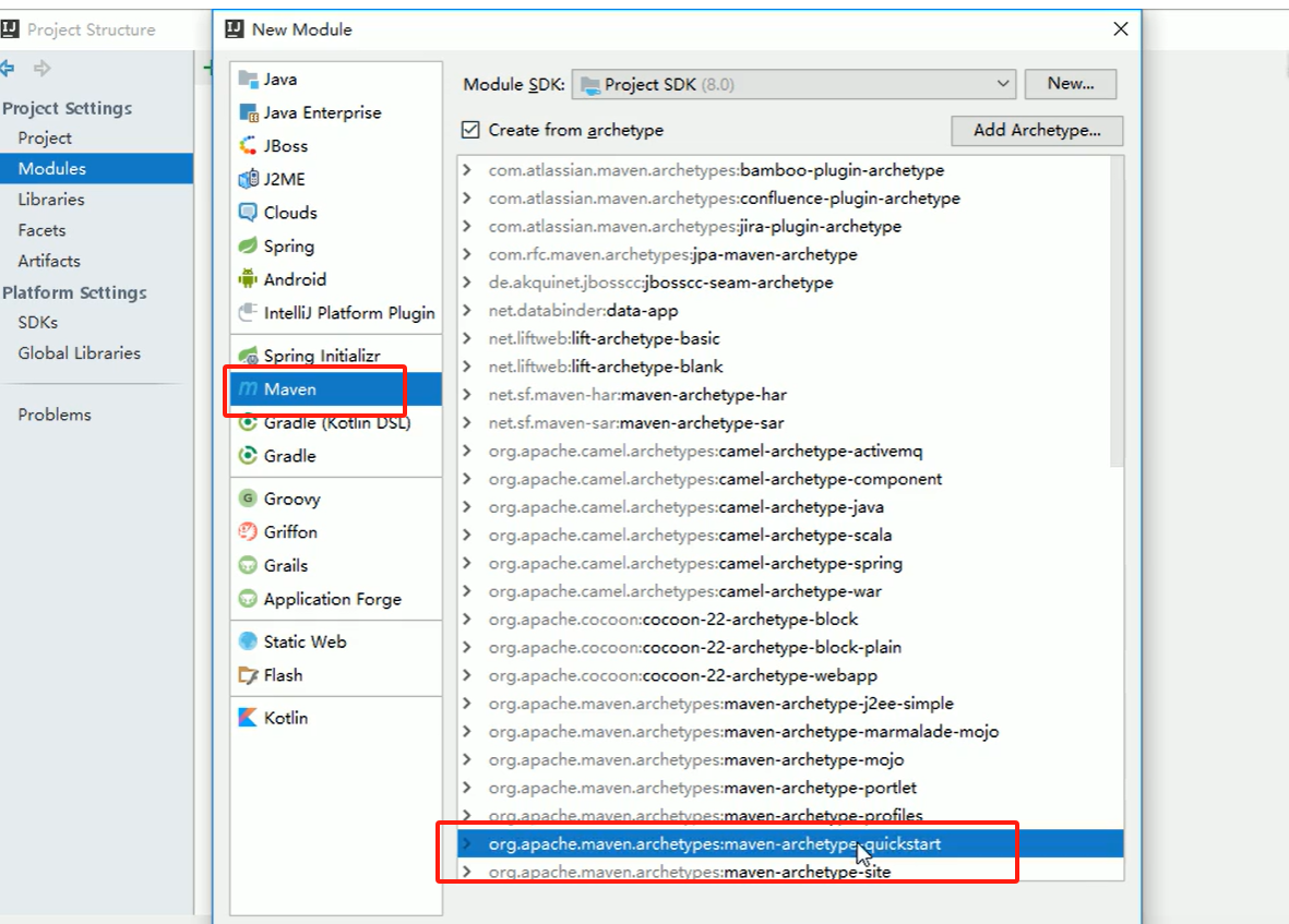 1.ideal上创建空项目--->点击ok创建目录--->Modules--->quickstart,如下图--->next--->项目名称