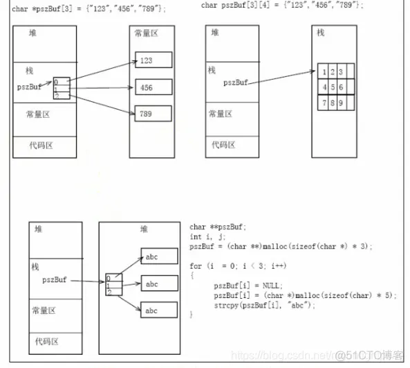 1》指针数组:指针指向栈区的一段内存的首地址,并且栈区分配内存空间,每个元素又装有一个指针指向常量区的某一个地址