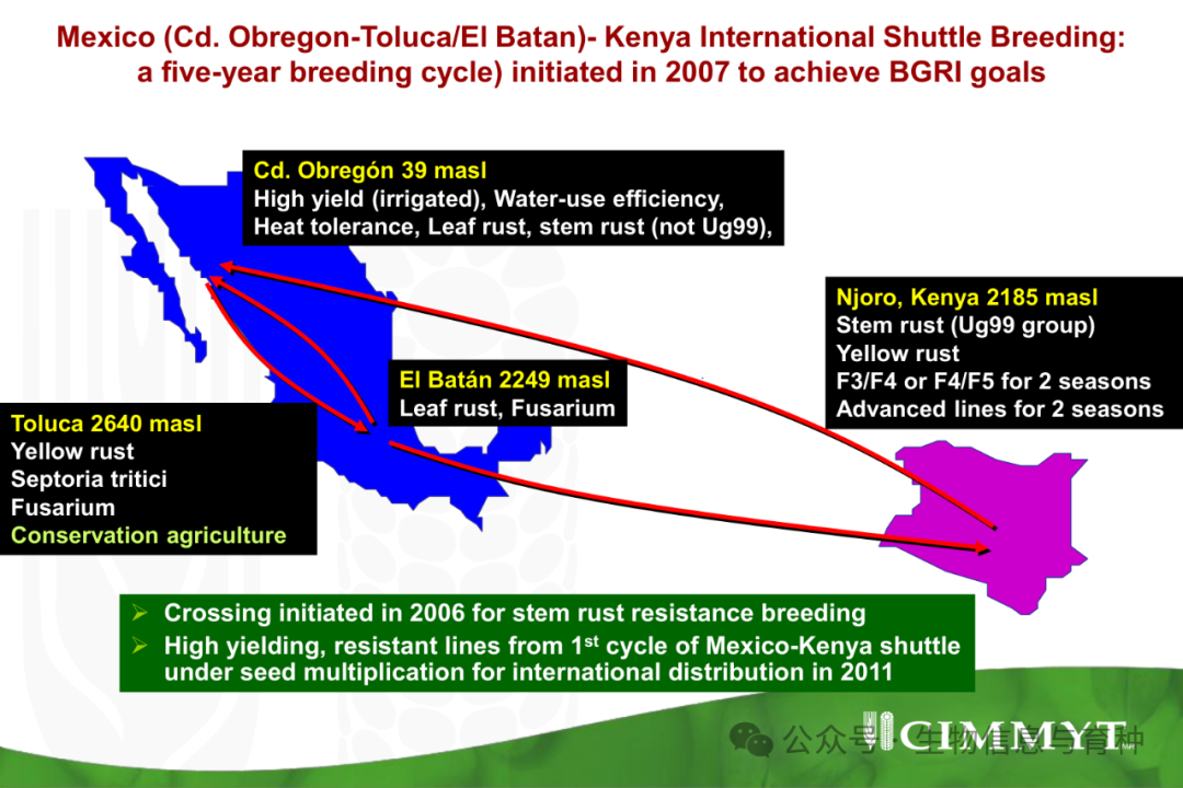 - • 采用国际穿梭育种(墨西哥-肯尼亚),结合不同环境下的抗性筛选和高产性状选择。