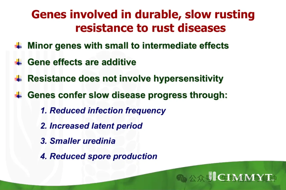 - • 非小种特异性抗性(慢锈性抗性):通过多个微效基因的累加效应实现持久抗性,特点是减少感染频率、延长潜伏期、减小病斑和孢子产量。