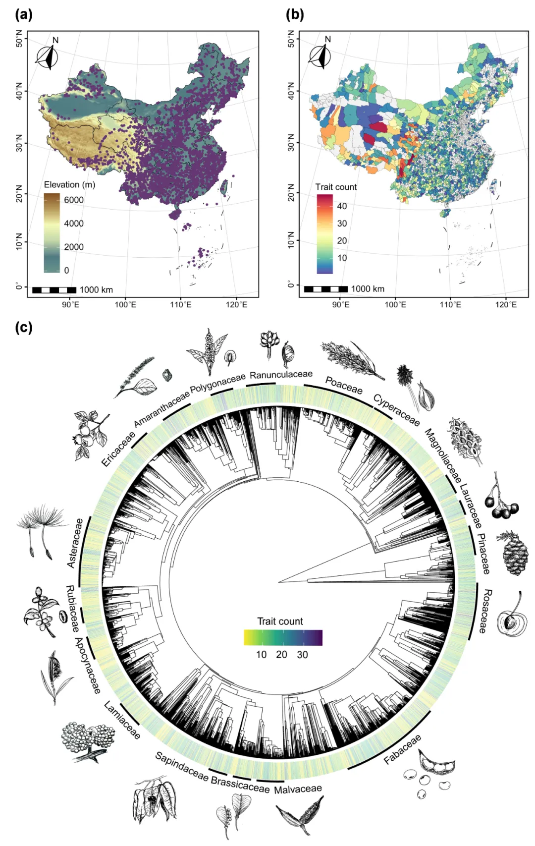 图三 中国种子性状数据库的地理及系统发育分布