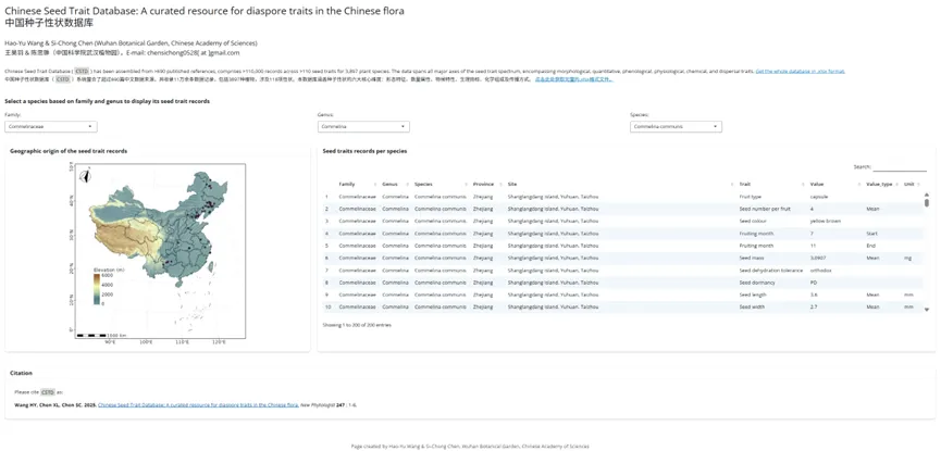 中国种子性状数据库属于完全开放获取,用户可通过Shiny交互式网页平台在线浏览、筛选和下载数据。欢迎自由使用,使用后请务必引用原文:Wang HY, Chen XL, Chen SC. 2025. Chinese Seed Trait Database: A curated resource for diaspore traits in the Chinese flora. New Phytologist 247: 1-6. http://doi.org/10.1111/nph.70296