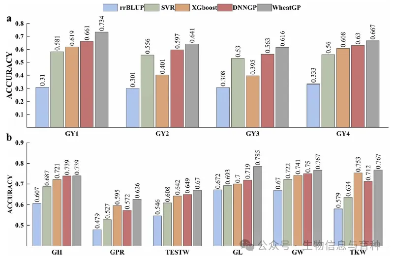 - • 预测准确性:WheatGP在预测小麦产量和多种农艺性状方面表现出色,预测准确率在不同环境下达到0.73,对于各种农艺性状的预测准确率在0.62到0.78之间。与其他方法(如rrBLUP、XGBoost、SVR和DNNGP)相比,WheatGP在预测准确性上具有明显优势。