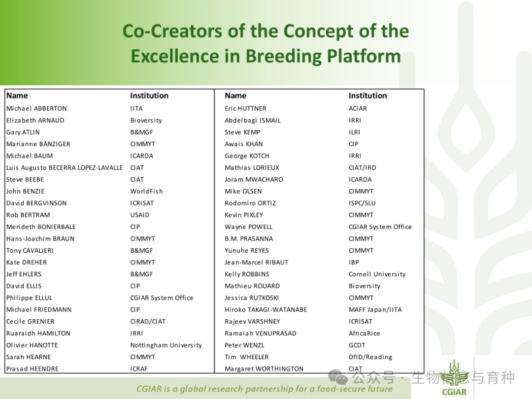 报告列出了来自 CGIAR 各中心、国际组织、大学和私营部门的多位专家,他们共同参与了 CGIAR 育种卓越平台的概念创建。
