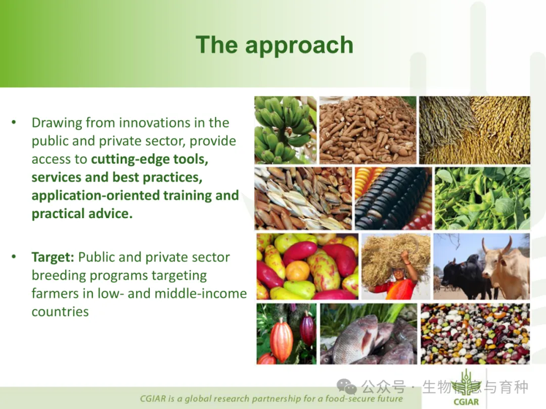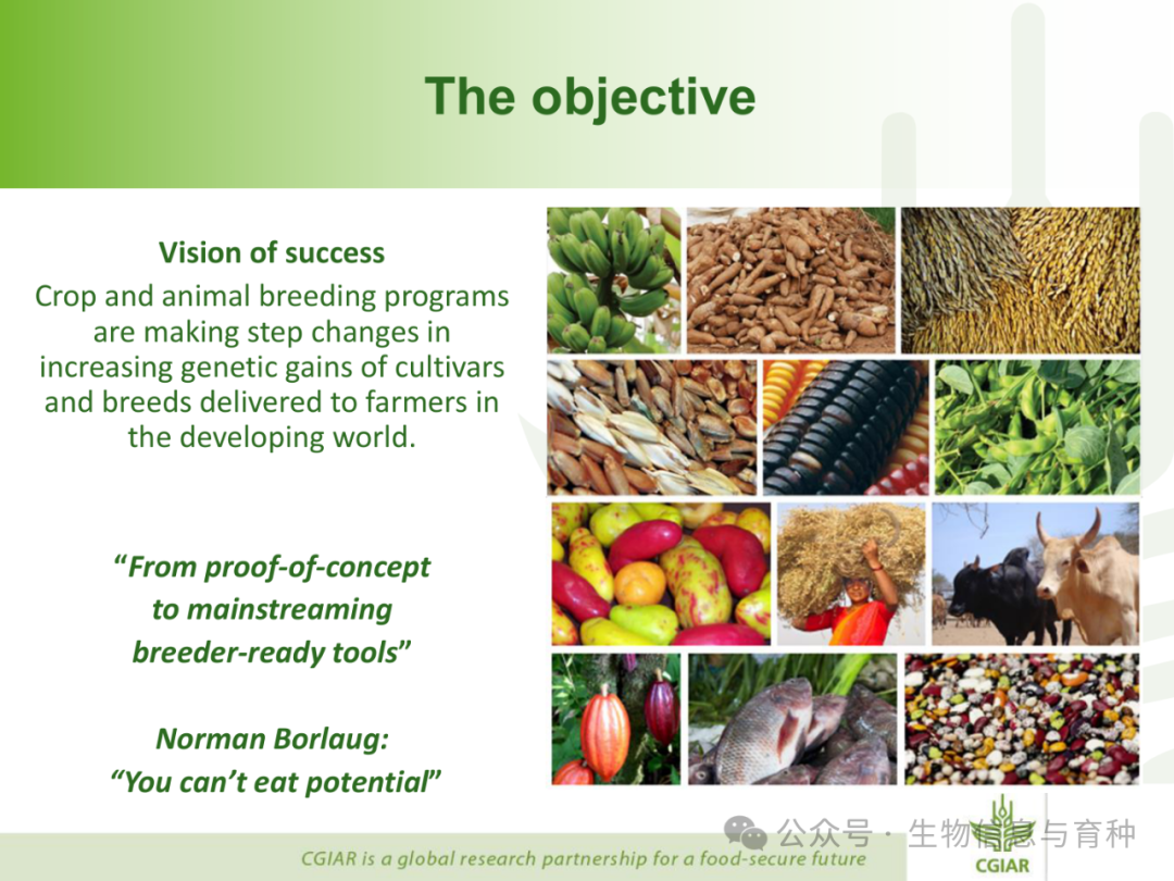 - • 愿景:通过提供前沿工具、服务和最佳实践,帮助作物和动物育种计划显著提高向发展中国家农民提供的品种和品种的遗传增益。