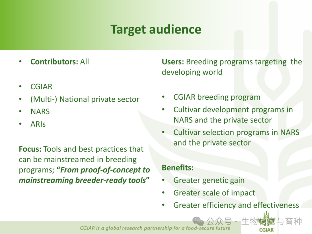 - • 用户:主要针对发展中国家的 CGIAR 育种计划、国家农业研究系统和私营部门的品种开发和选择计划。