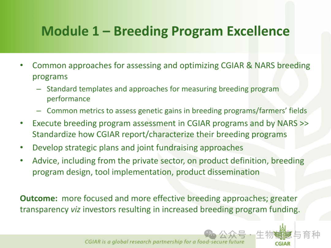 - • 目标:通过标准化评估和优化 CGIAR 和 NARS 育种计划,提供战略规划和联合筹资建议。