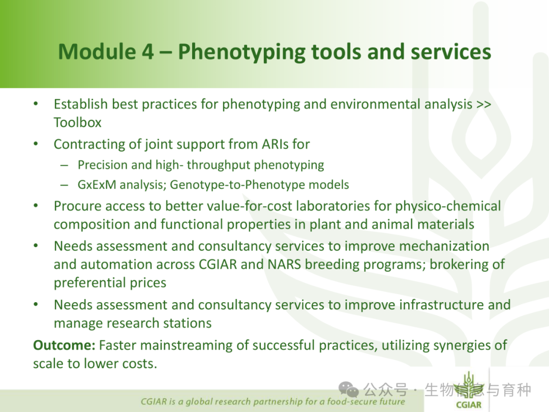 - • 成果:支持育种计划数据的常规使用,包括基因组和高通量表型信息。
