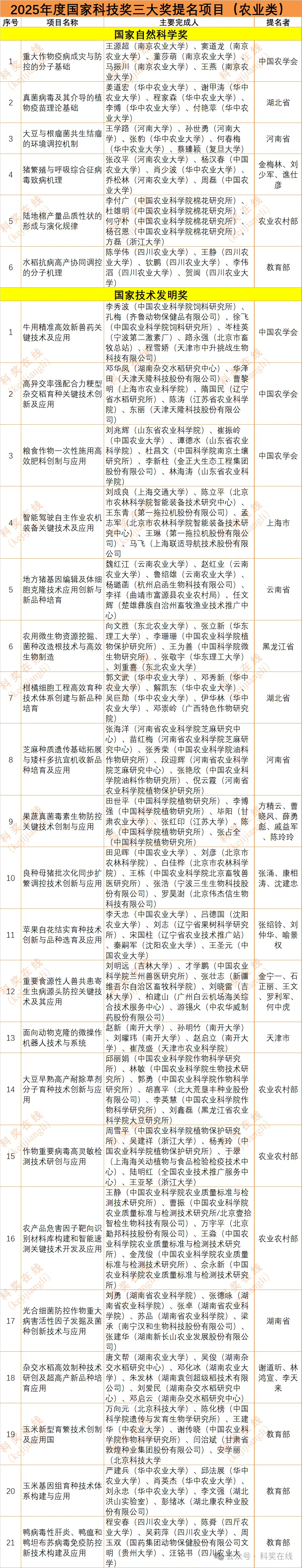 科奖在线整理了2025年各提名单位公布的国家科学技术奖-农学类成果名单。具体如下(仅供参考,具体以政府消息为准):