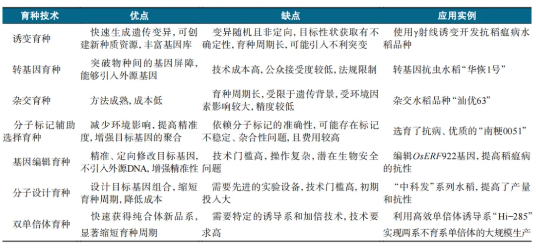 表1 水稻传统育种技术与前沿育种技术的优缺点及应用实例
