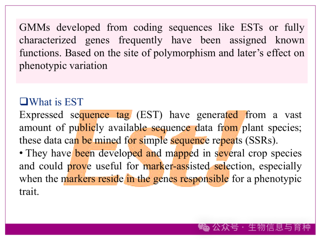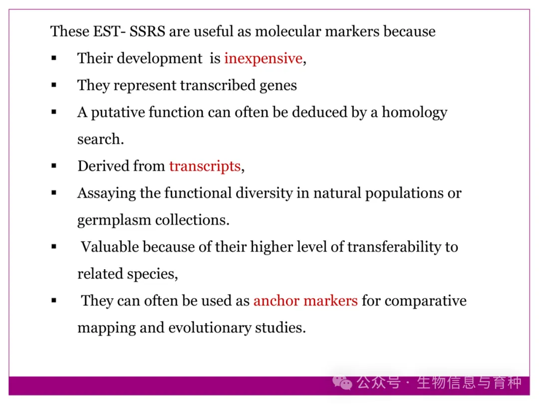 - 4. EST-SSR 等“基因标记”成本低、功能明确、跨物种可转移。