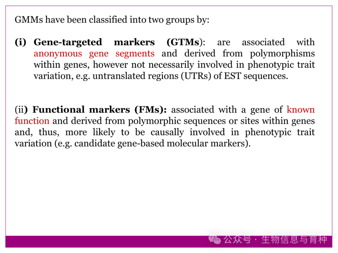 - • 标记类型与开发:从形态标记 → 蛋白标记 → 微卫星/ SNP → 基因内功能标记(GMM、FM)。