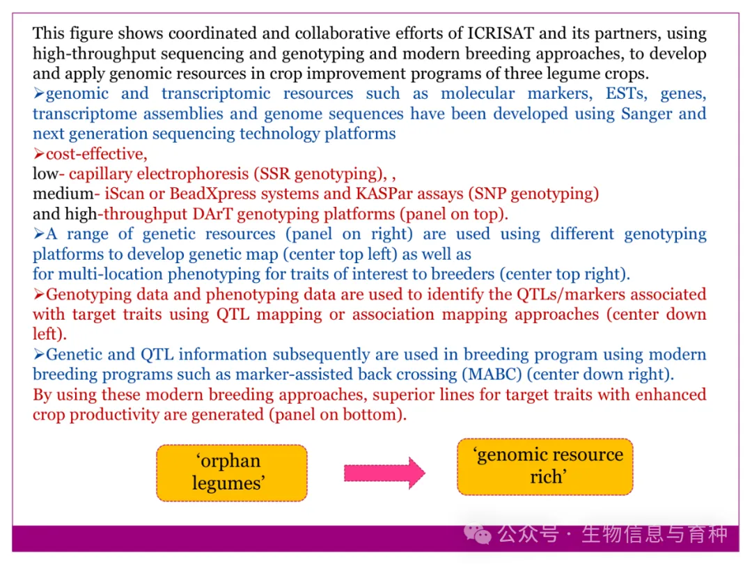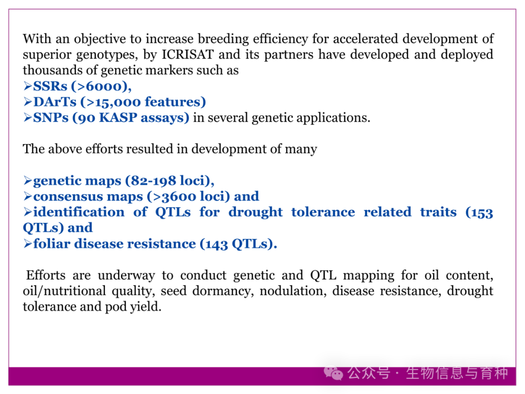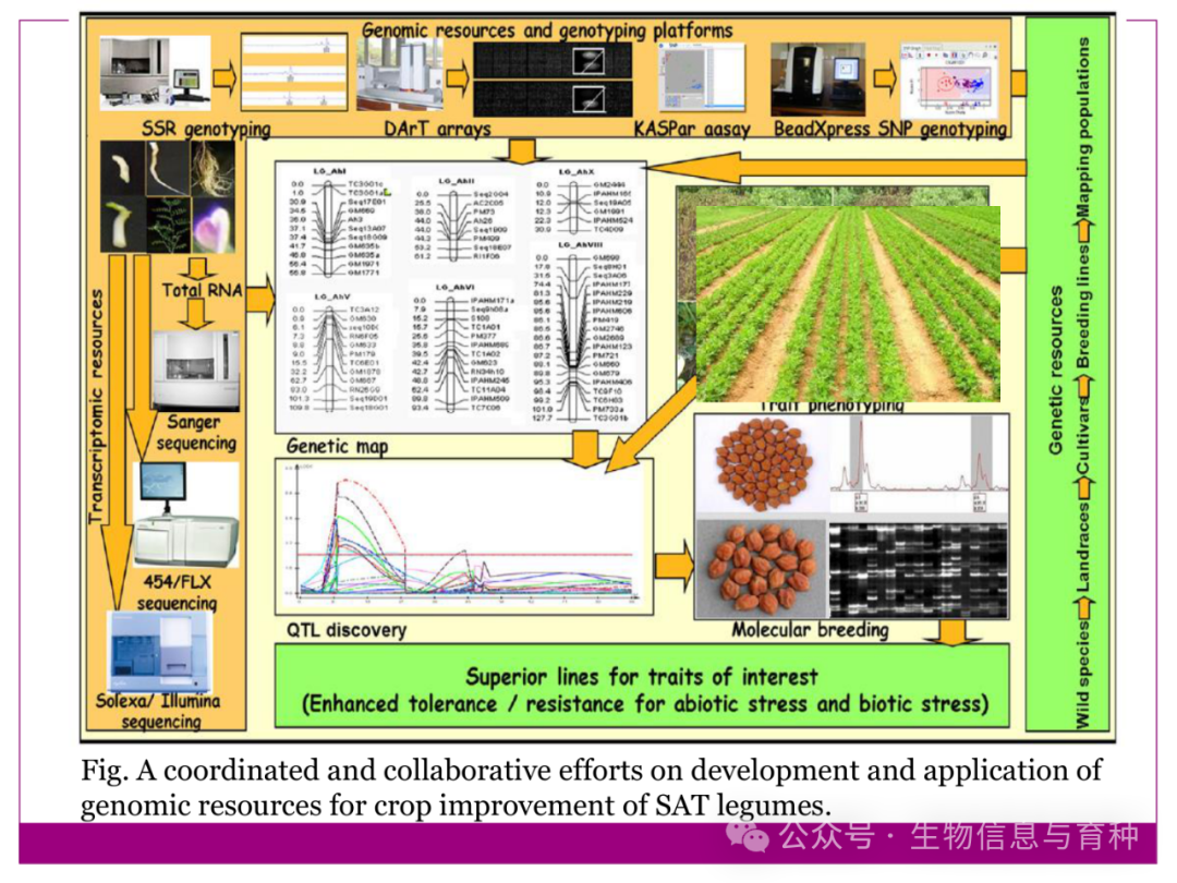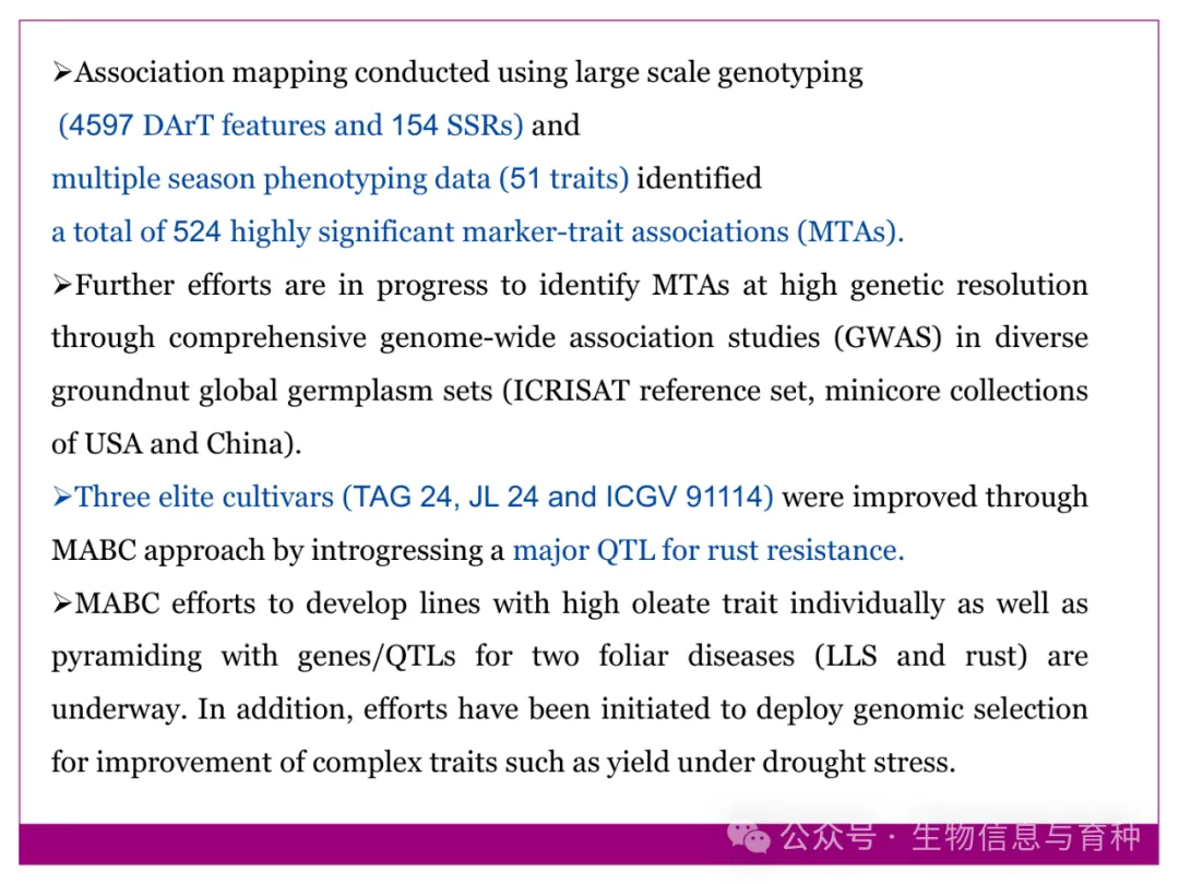 - • 木豆、花生:构建高密度遗传图与共识图,鉴定出 >150 个耐旱、抗叶病 QTL;通过 MABC 向 3 个主栽花生品种导入抗锈病 QTL,并启动高油酸、抗旱等复杂性状的基因组选择。