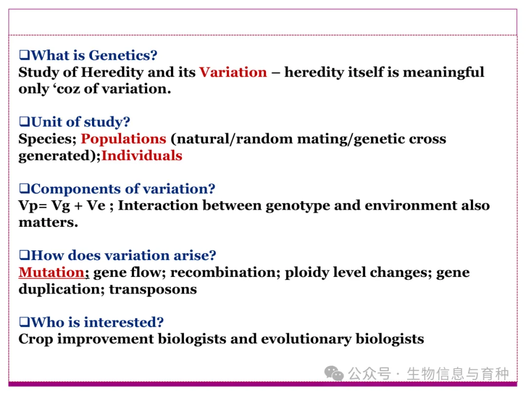 - 1. 变异是遗传改良的原材料;突变、重组、基因流等是主要来源。