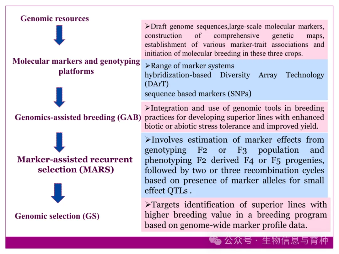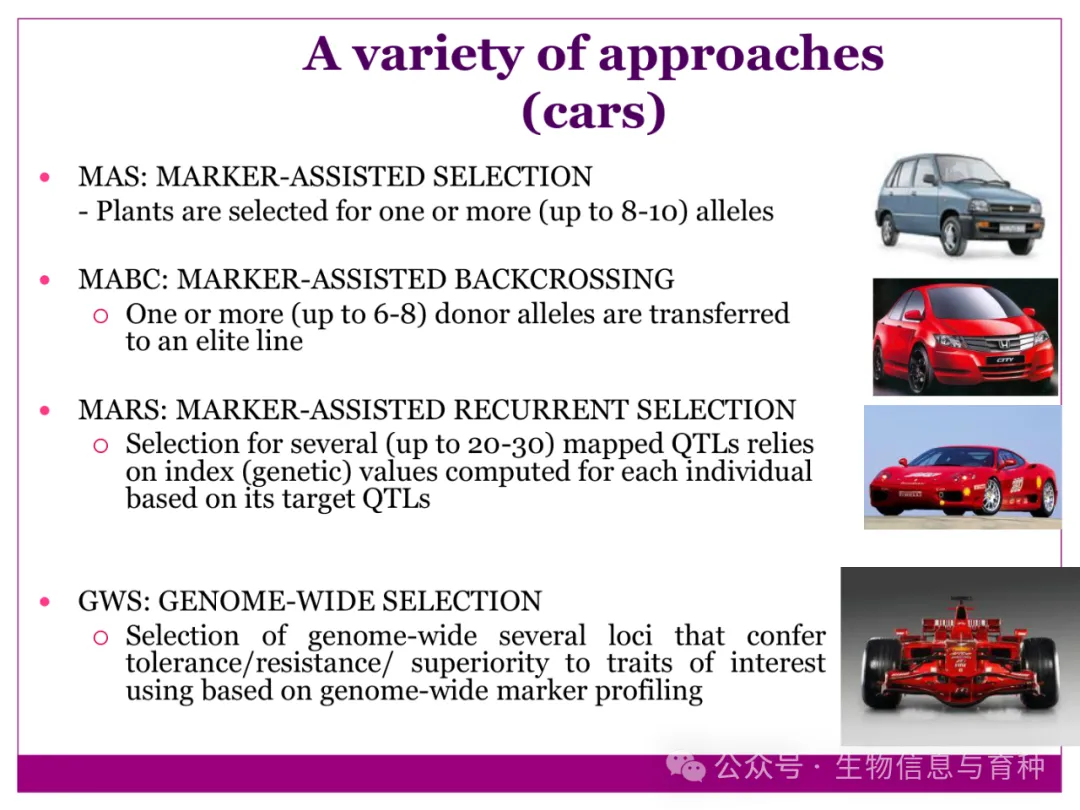 - • 四大分子育种策略:MAS、MABC、MARS、GWS(基因组选择)。