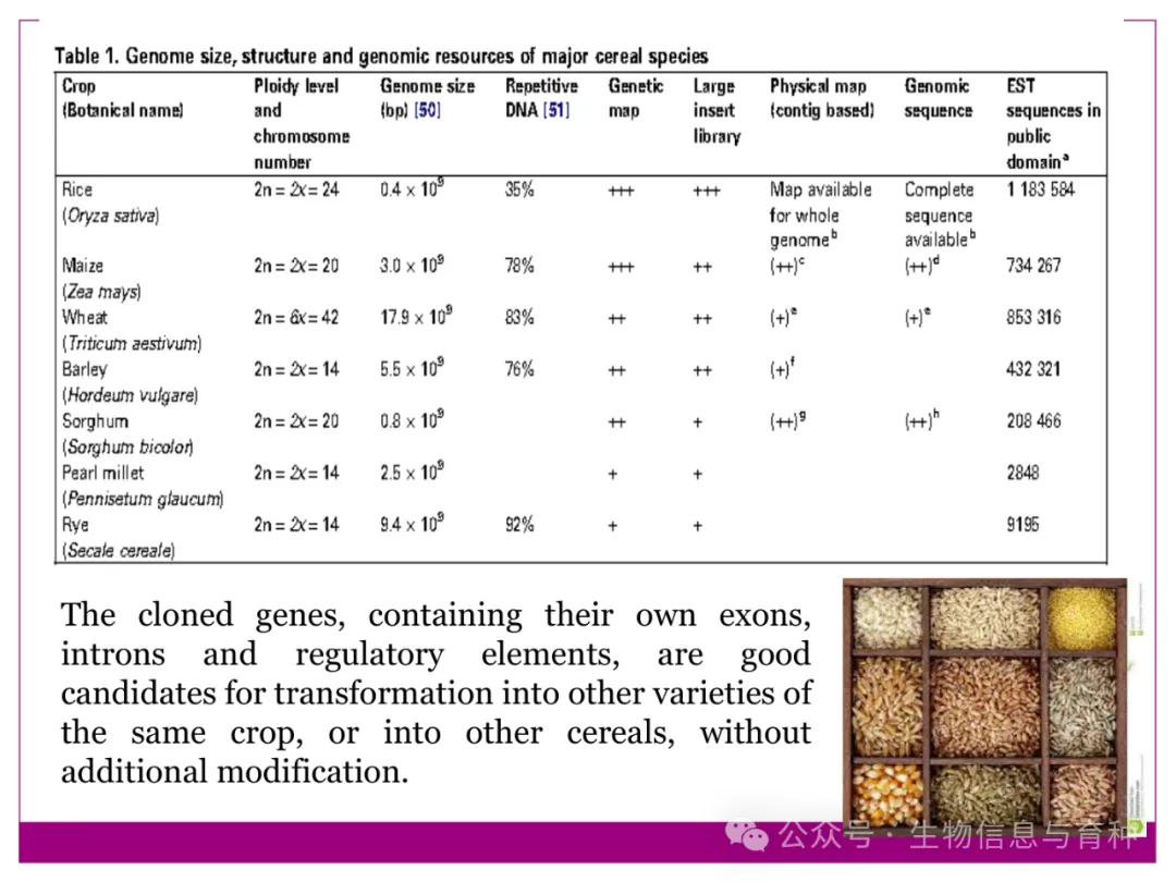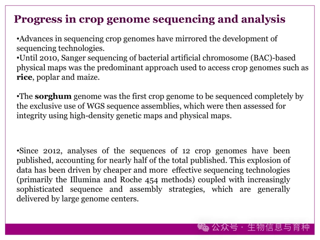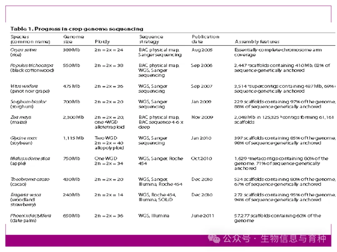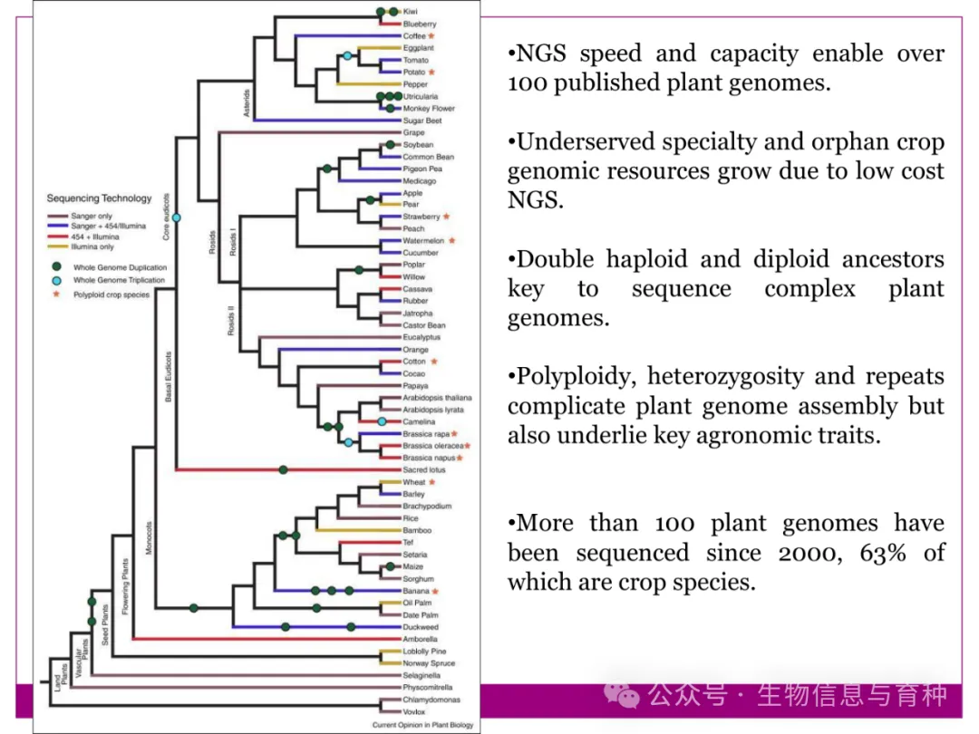 - • 作物测序爆发:2000 年以来上千个植物基因组发表,63% 为作物;NGS 使“孤儿作物”基因组学成为可能。