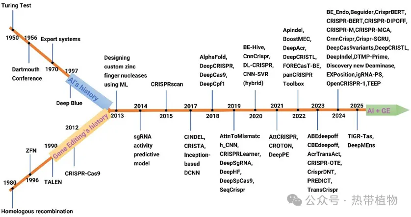 Figure 1. A schematic timeline illustrating the historical evolution and integration of key events in artificial intelligence (AI) and genome editing (GE).