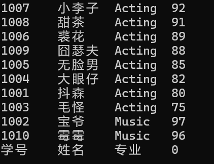 cout << student.id << "\t" << student.name << "\t" << student.major << "\t" << student.score << "\n";