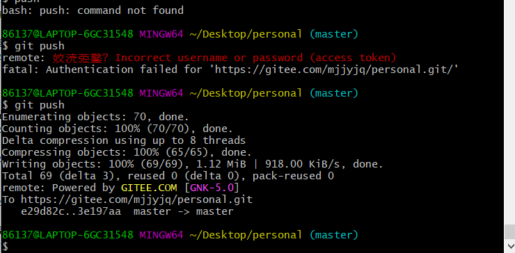 本来一切顺利,但是在最后的push上发生了错误,然后通过百度搜索资料成功得以解决