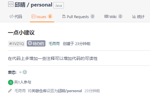 对于邱晴同学的代码她的注释较为简单,因此对她进行了一个小小的建议增加代码的注释 https://gitee.com/daydreamer1/personal