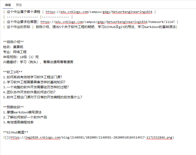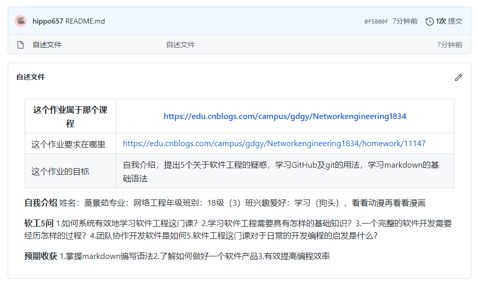 | 这个作业的目标 | 自我介绍、提出5个关于软件工程的疑惑、学习GitHub及git的用法、学习markdown的基础语法 |