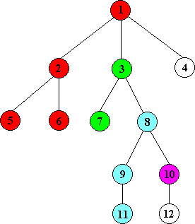 Tarjan作为离线off-line算法,在程序开始前,需要将所有等待询问的节点对提前存储,然后程序从树根开始执行TarjanLCA()。假如有如下一棵多叉树