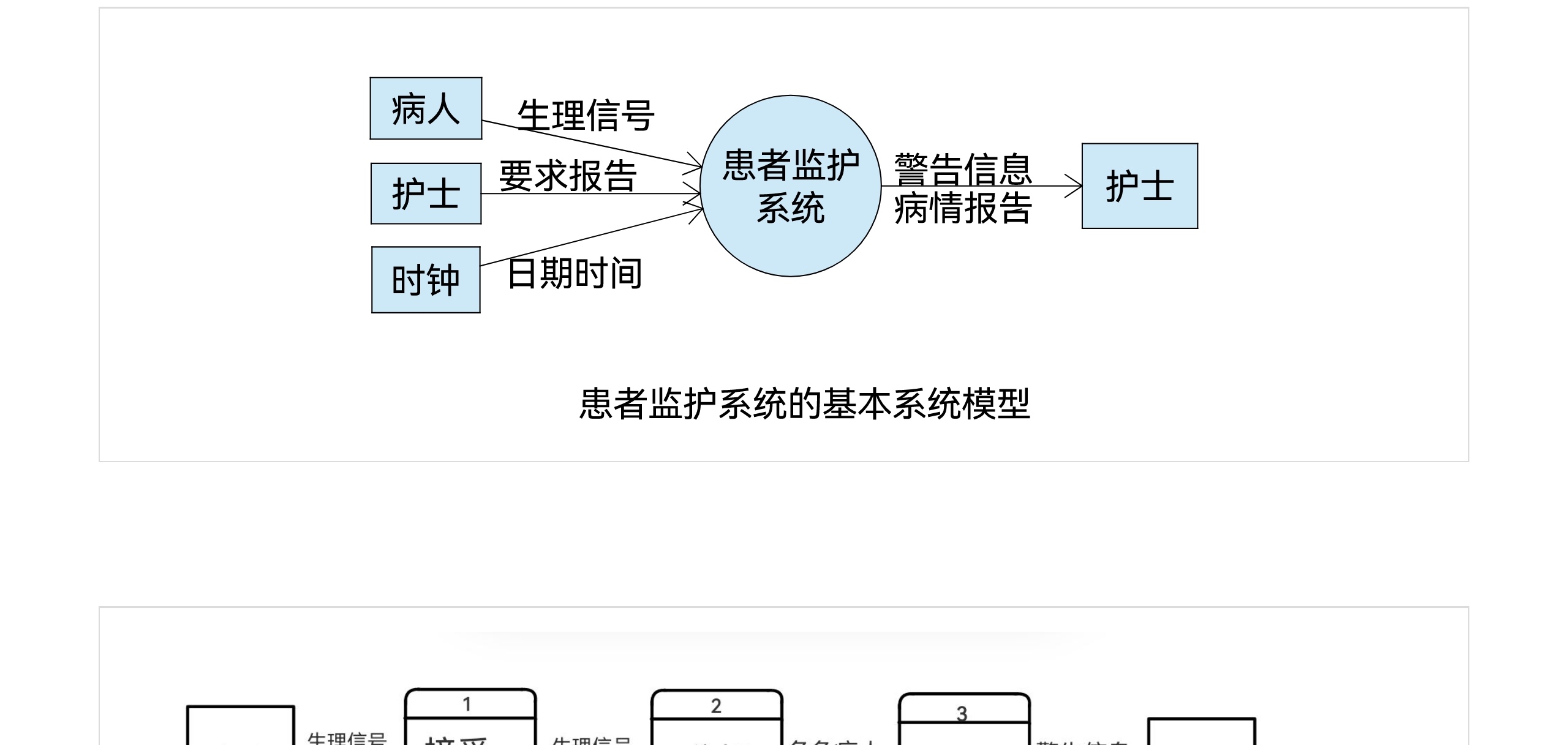 ①本系统的数据源点是“病人”和“护士”,“病人”提供生理信号,“护士”提供要求的病情报告。