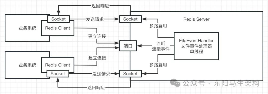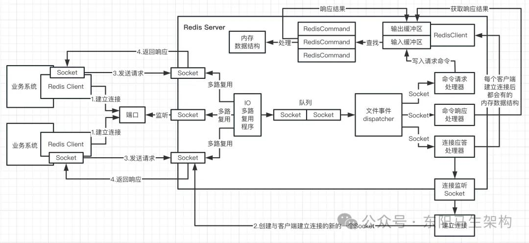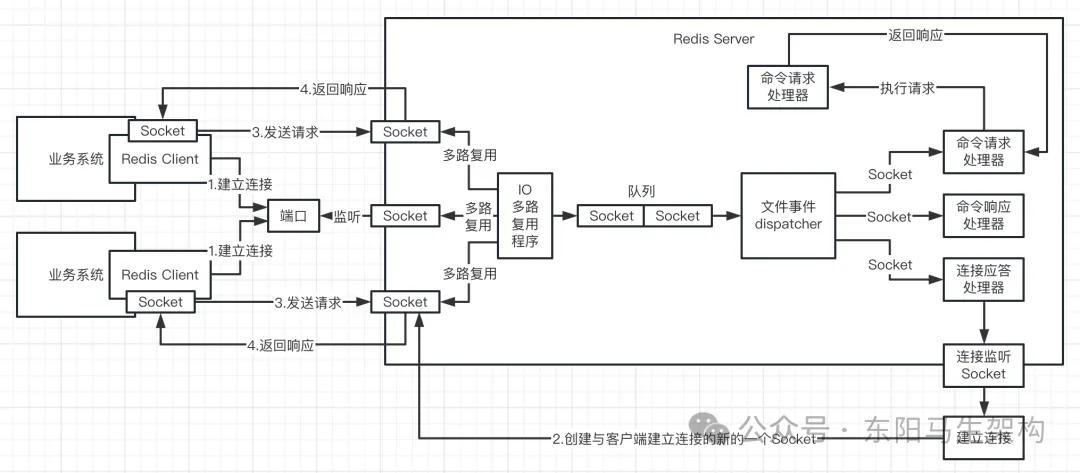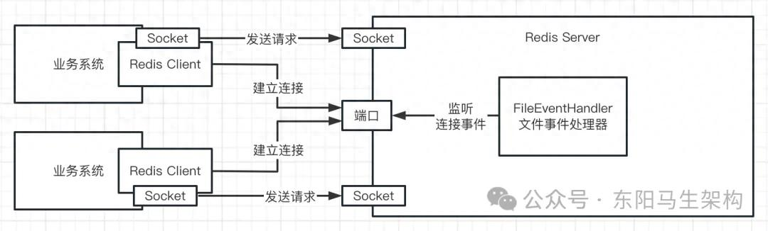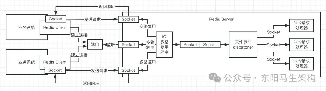 大量Redis Client和Redis Server建立连接后,会基于Socket在短时间内高并发地发送命令请求。于是Redis Server的各个Socket短时间内就会出现大量的网络事件,这些网络事件会全部通过队列 + 单线程来进行串行化处理。