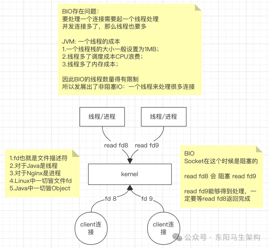 阻塞IO(BIO)的缺点:为每个连接配套一条独立的线程,或者一条线程维护一个连接成功的IO流的读写。在并发量小的情况下,使用BIO模型没什么问题。但在高并发场景下,则需要大量线程来维护大量网络连接。此时内存、线程切换开销会非常巨大,因此BIO模型在高并发场景下不可用。