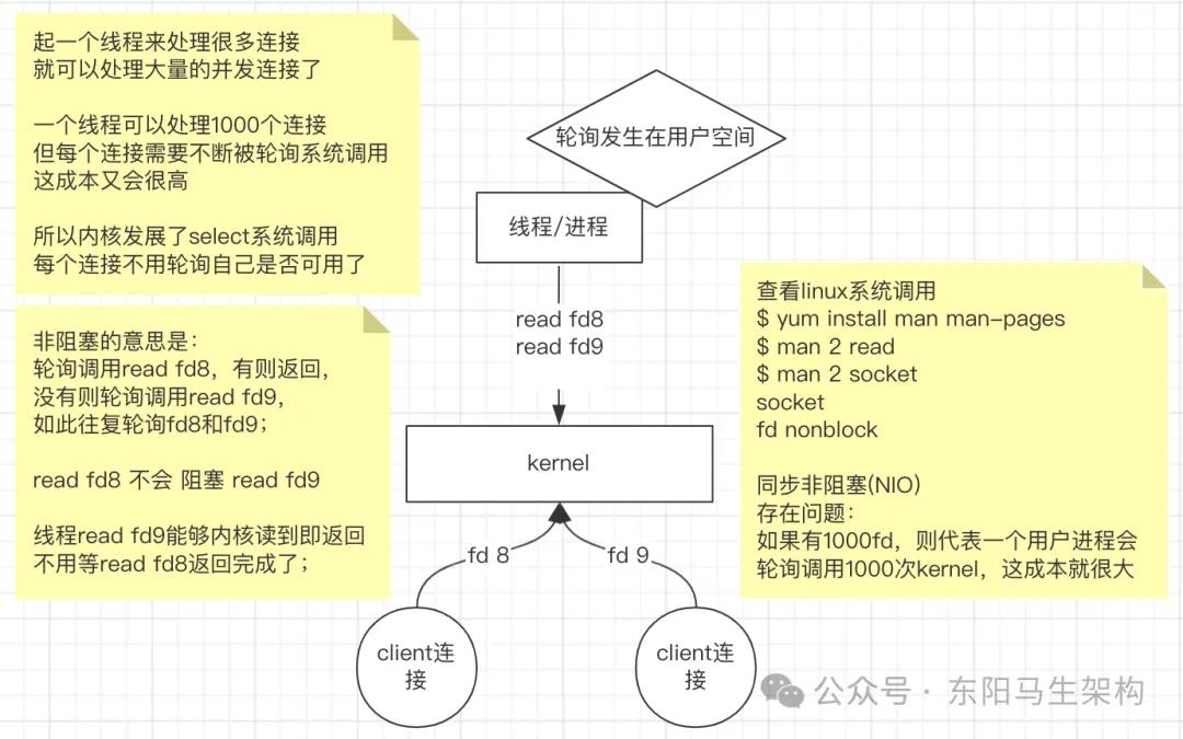 非阻塞IO的缺点:需要不断重复发起IO系统调用。这种不断轮询,将不断地询问内核,将占用大量的CPU时间,系统资源利用率较低。