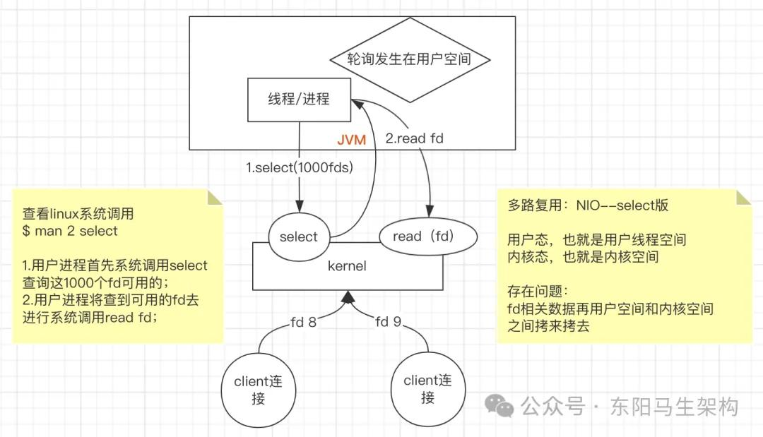 IO多路复用模型,就是内核后来发展了,产生了一种新的系统调用select/epoll。通过select/epoll系统调用,一个线程可以监视多个文件描述符。一旦某个描述符就绪(一般是内核缓冲区可读/可写),内核能够通知程序进行相应的IO系统调用。非阻塞的BIO就是一个线程只能轮询自己的一个文件描述符。