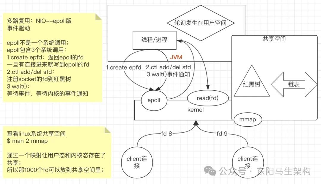 步骤一:进行select/epoll系统调用,查询可读的连接,内核会查询select/epoll系统调用的可查询Socket列表。当任何一个Socket中的数据准备好了,select/epoll系统调用就会返回。当用户线程调用了select/epoll系统调用,则整个线程会被阻塞。