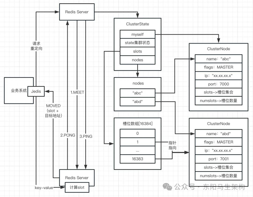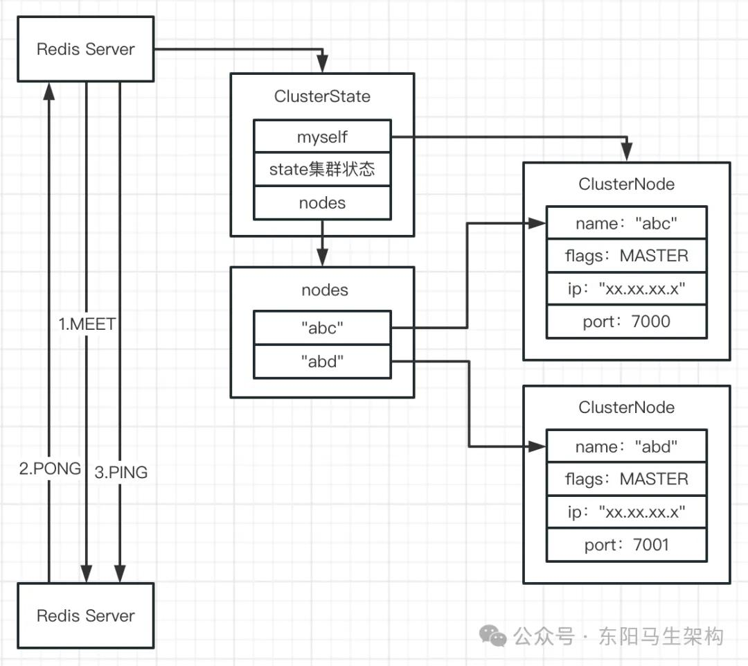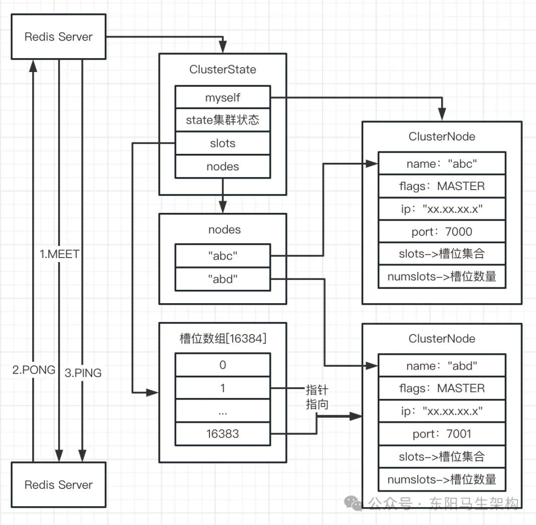 具体来说就是会以一台Redis节点为基础,告诉它有另外一个Redis节点。首先Redis Server会给要连接的其他Redis节点,在自己内存里创建一个ClusterNode数据结构。然后发送一条meet消息到要连接的其他Redis节点上,该Redis节点收到一条meet消息后会也在内存里创建一个ClusterNode,并返回一条pong消息。当这个Redis Server收到pong消息后,又会发出一条ping消息给这个要连接的其他Redis节点。