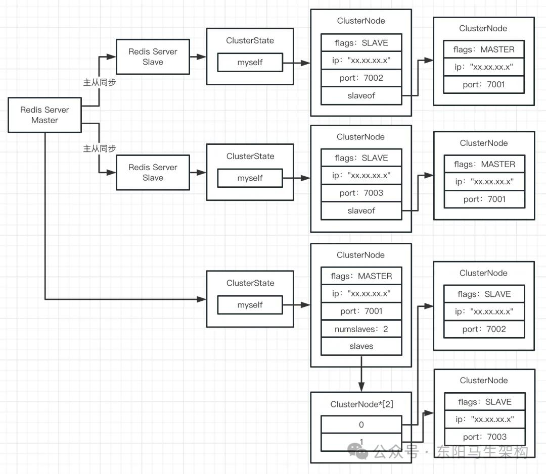 在主节点的ClusterNode中,其slaves字段中会指向具体的从节点的ClusterNode。