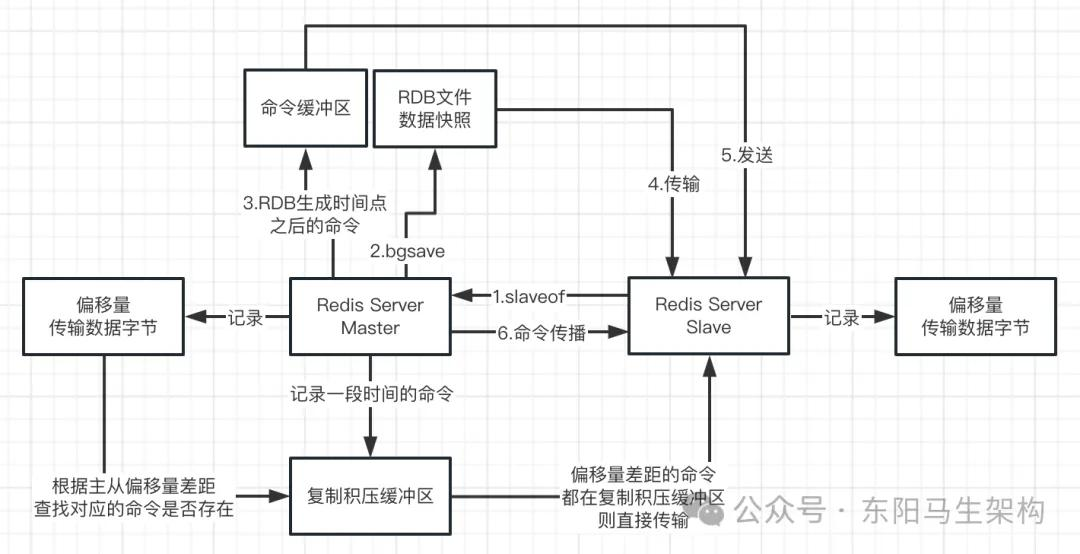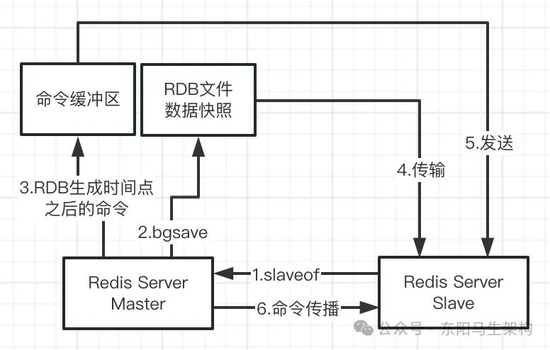 步骤五:最后主节点通过命令传播机制,把主节点最新的命令操作也同步给从节点
