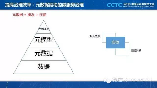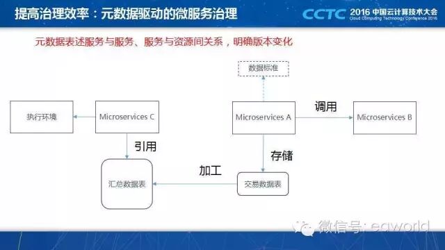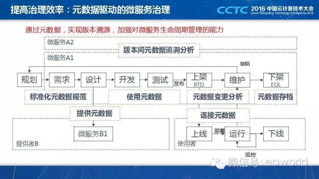 面向互联网应用的微服务架构,是一个分布式架构,比较复杂,因此必须提高治理的效率,我们是用元数据来完成的,这是一个元数据在微服务架构中应用的例子。